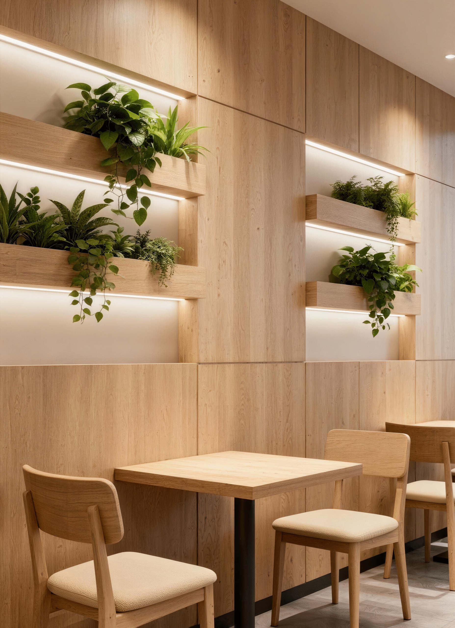 This renderings captures peaceful essence and a minimalist Nordic vibe of oak paneling, integrated planters with hanging greenery, and soft LED glow that highlights wood veins and leaf nuances. Gentle shadows, tactile reflections, and organic details evoke relaxation and intentional coziness.